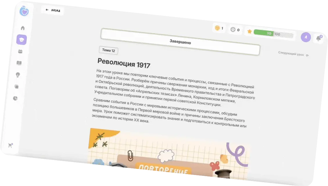 Пришло время повторения — и тут в игру вступают наши карточки. Это настоящий тренажёр для мозга! Ты выбираешь темы, а мы подсказываем, когда и что повторить, чтобы не забыть.